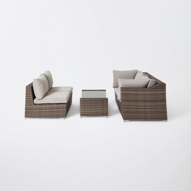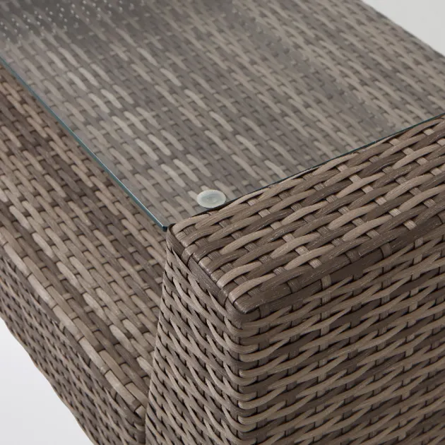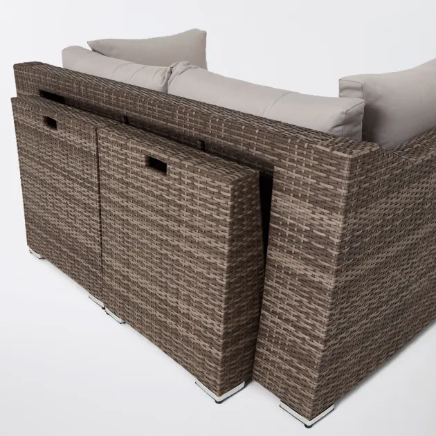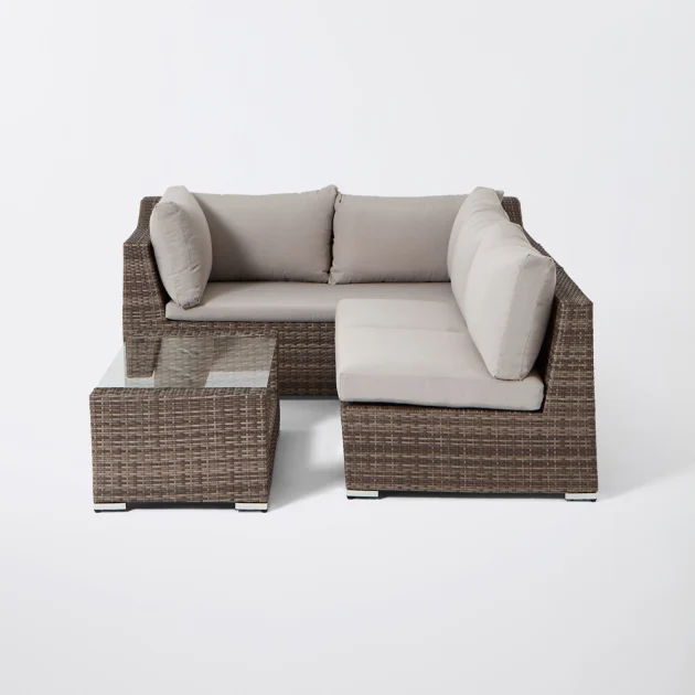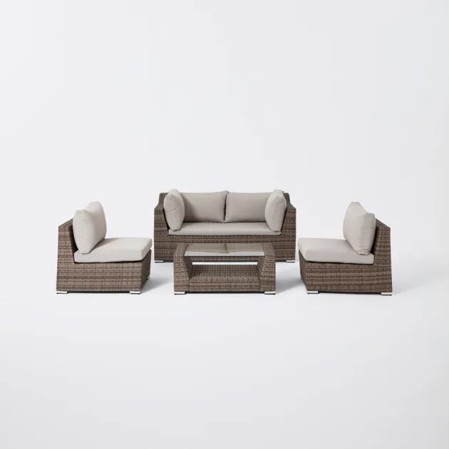 Conjunto modular de jardim Maevea. Crie o seu próprio espaço no seu jardim com este conjunto modular de café. Mude facilmente a configuração quando tiver convidados ou quiser experimentar algo um pouco diferente. Graças ao seu design que poupa espaço, é fácil de armazenar quando não está a ser utilizado. Graças a este conjunto poderá criar diferentes configurações com o seu mobiliário, adaptando-o à situação que desejar. Desta forma, terá sempre um novo conjunto que se enquadra em diferentes ambientes no seu jardim.